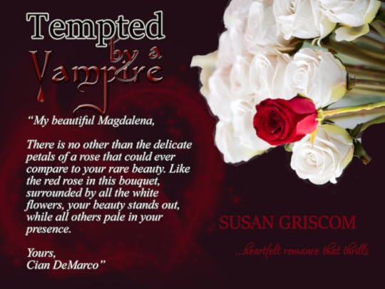 Unedited ExcerptTempted by a VampireCopyright 2015 by Susan Griscom “Is something wrong?” I asked.He shook his head. “Not a thing.” Then he reached out and took my hand in his, turning it over, revealing my palm. He held my hand, gently tracing his finger over the top line.“You have a very warm heart, Magdalena.”“You’re reading my palm?”“This is known, not only from looking at your palm but also in here.” He placed his other hand over my left breast, and I couldn’t breathe. He left it there for a few seconds as he gazed into my eyes and then removed it, focusing his attention back to my palm. “You have had many periods of sadness and sorrow in love. I am sorry for that.”I gave him a timid smile, thinking of my parents, not to mention that I’d just broken up with Kellen and he knew it. “I don’t believe in fortune telling.”“You don’t?”“No.”He ignored my negativity on the subject and continued to softly skim the lines on my hand. I thought of the psychic reader, Tessa, who Vanessa and I had gone to see right before going to the club. She’d said I’d fall…”Oh, crap,” I said out loud.“Is everything okay?” Cian asked.“Yes. Everything is fine.” I didn’t want to tell Cian what Tessa had told me about falling under temptation, because I had a sneaky suspicion that he was the temptation I was about to fall into. I couldn’t help think about the “meeting someone dark” part of that reading, though. Cian was not dark. In fact, his skin was very fair. He continued to trace his finger very delicately down the center line of my palm, all the way to my wrist and slowly back up the middle, stopping at the point where my pulse beat. He drew tiny circles around my vein, sending shivers up my spine. I felt my heart thump in my chest, and he looked up at me and smiled. “You’re nervous,” he said.I bit my bottom lip. God, yes, I was. But I didn’t say anything, only watched his finger circle around as my stomach fluttered with desire for him.