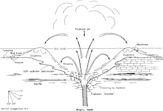At least one study has pointed out that the deposition of the tuffaceous mounds occurred in conjunction with submarine volcanic vents which emitted volcanic ash which then was deposited in the form of mounds, which subsequently altered to palagonite. The volcanic activity occurred with the deposition of chalk and marl of the upper Austin and lower Taylor Groups, which served as both source and seal.