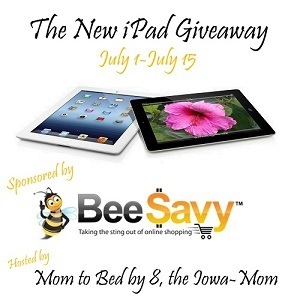 Mom to Bed by 8, the Iowa-Mom is proud to present the The New iPad Giveaway Event, sponsored by BeeSavy.