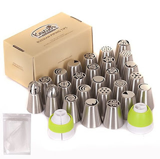 • COMPLETE ICING DECORATING KIT: The KESTILOS CAKE DECORATING NOZZLE SET is the ultimate when creating beautiful icing designs on cakes, cupcakes, cookies, or pastries; made of durable stainless steel, this set of 23 Russian Piping Tips includes a Regular 3 Color Coupler, 2 Large Sphere Ball Tips with a 3 Color Coupler, and 5 Disposable Bags plus a downloadable Ebook of instructions and recipes for cake decorating; all come in a gift box that is 6.3 by 3.1 by 3.5 inches;• CREATE MULTIPLE DESIGNS: The KESTILOS CAKE DECORATING NOZZLE SET provides everything you need to design one-of-a-kind icing creations; use the 23 tips to make unique flowers, petals, drops, round or oval shapes, thin and thick lines, or wedges with eye-catching, colorful patterns on cakes, biscuits, cookies, and more; plus the 2 Large Balls offer more icing extravaganzas as accent pieces; with the regular and large 3 color couplers, making unique icing designs is easy;• MADE OF TOP QUALITY MATERIALS: All KESTILOS CAKE DECORATING NOZZLE TIPS are made of high-quality food-grade 18/8 stainless steel, so they are safe to use for adults and children; the two 3 color couplers are made of ABS plastic and are BPA free and non-toxic as are the 5 included disposable pastry bags; all metal and plastic pieces are dishwasher safe and easy to keep clean;• FREE GIFTS INCLUDED: With each 23 tips in the KESTILOS CAKE DECORATING NOZZLE SET comes 2 over-sized LARGE BALL TIPS with a Large 3 Color Coupler to design big flowers or objects with icing; also added are 5 disposable pastry bags that are easy to use; a free downloadable ebook with tips, instructions, and recipes that is emailed after purchase will turn the novice cake decorator into a professional; it makes the perfect gift; no more cheaply made, disposable plastic nozzles;• 100% SATISFACTION GUARANTEE: We want you to be completely satisfied with your purchase so offer a 30 day money-back guarantee; if there are any questions or concerns for any reason, please contact us immediately; BUY RISK-FREE WITH CONFIDENCE the KESTILOS CAKE DECORATING NOZZLE SET today and get FREE the 2 Large Sphere Ball Tips, 2 Couplers, 5 Disposable Pastry Bags, and Downloadable Ebook; this gift is perfect for bakers, chefs, or do-it-yourself bakers.MY REVIEW