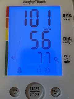 This is an Easy@Home blood pressure monitor. I've had it for a few weeks and have been pleased with its performance. I had to wear a heart monitor the first of November because I had been fainting and having dizzy spells. They couldn't find anything. When I got this monitor to review, I was sure it would prove what I suspected all along, that my blood pressure is low. As you can see from the picture above, my blood pressure was low. That isn't the lowest it gets. It will drop to 90/50 at night. The cuff is large, even though I don't need a large, it still fits a normal arm. My husband has a large bicep, so this has come in handy to check his bp as well.