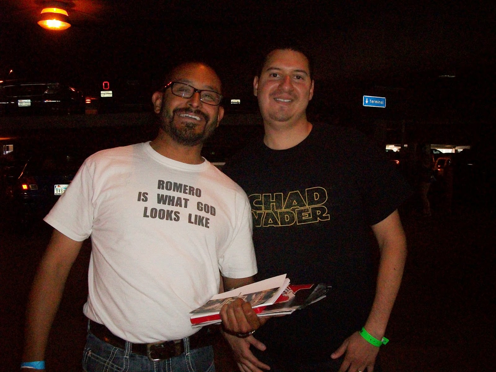 Here's me with George A. Romero. I wore my 'Romero is what God looks like' shirt.You won't believe how he responded: "It's funny but it's just wrong."