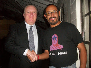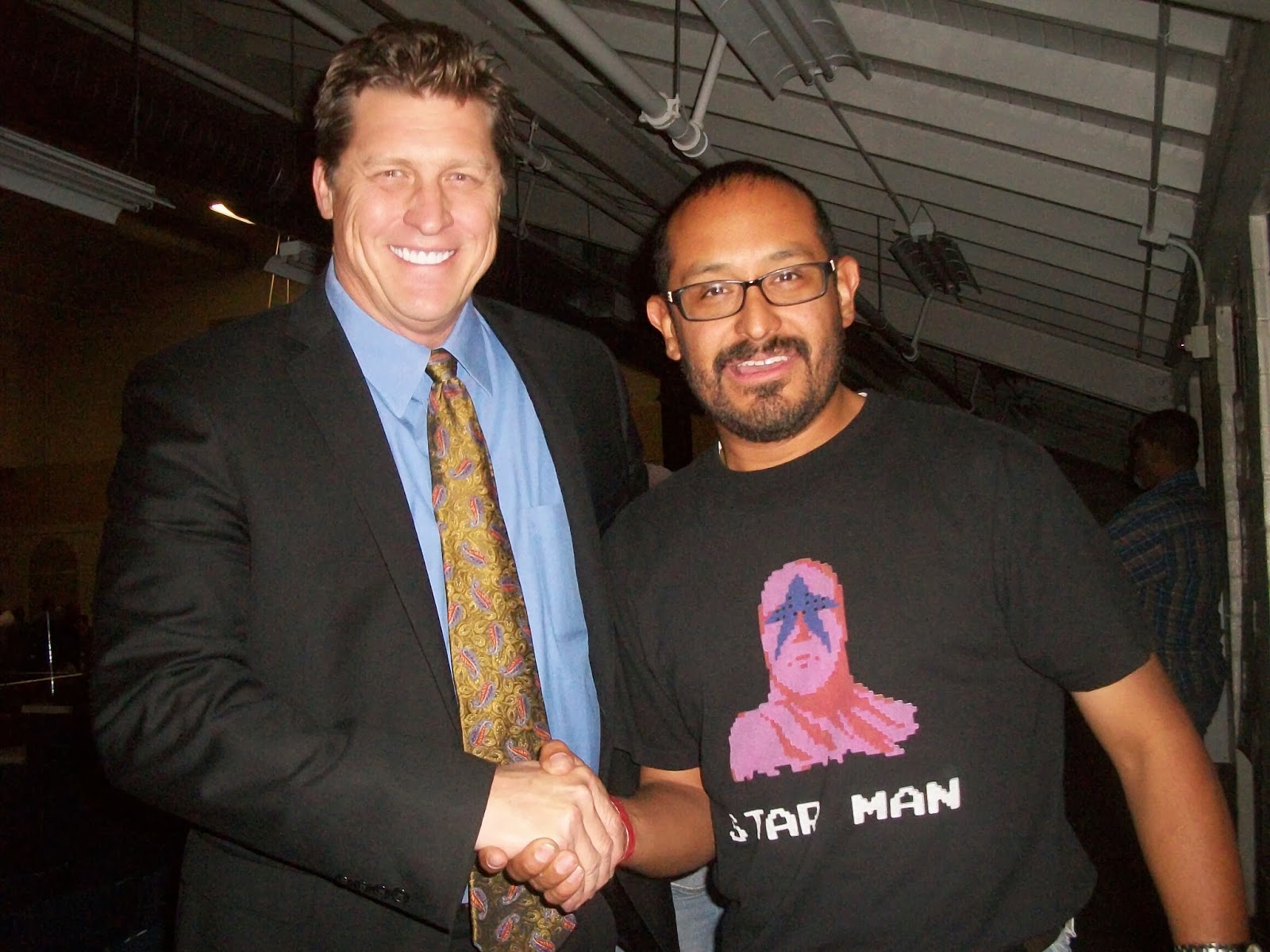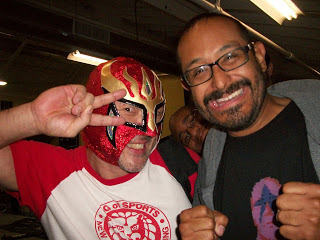 MY LITTLE GIRL'S FIRST SHOW - My little girl has been to a WWE wrestling show before, but we were sitting in the rafters. This time around, I got us front row tickets to the fun. Well, those who know me know that I enjoy myself and understand the athletic magic show that is pro-wrestling. But the brutal illusion was a little hard for her to take after the first match featuring RUDY RUSSO, WEEZY WOO, national talent CHASE OWENS, among others. The intensity was too much for her and she started shedding tears for the good guys, so we stepped to the back for a bit and watched the following matches from the back. She eventually got acclimated to the action and the fun and we moved back to the front. It was an unexpected, but wonderful experience. She really liked NWA-BOW heavyweight JAX DANE after he came out to help the new competitor, MR. MICAH, after his match with MIKE DELL when JEREMY SAGE'S friends came out to beat up Micah. The way my little girl saw it, Jax Dane stood up for the new kid who has no friends yet in NWA-BOW. My girl appreciated Jax coming out to help Micah and make friends with him. She also enjoyed SCOT SUMMERS match against GEDO and wanted to give Scot a hug after losing to him and Gedo jumped him. She eventually did, though. By the end of the night, she was totally into the show and had a good time. She's not quite ready for front row just yet, but I don't have any problem with that. And the greatest thing that happened? She got a picture with Jushin 'Thunder' Liger. And for me, she got to see an honest to God National Wrestling Alliance show. I GOT TO GET SOME MARK PHOTOS WITH NWA MOVERS AND SHAKERS It was a great time for some photo ops with names I read about online, as well as watch them in action. Here's some snaps. Below is a pic with one of the architects of the current NWA product, TONY BROOKLYN.