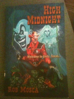 'High Midnight' by Rob Mosca is an outrageously wild 'grindhouse pulp'-style weird western. The story was amazingly eloquent in spite of its violent and spooky supernatural setting. When I saw a luchador sheriff on the cover at a horror convention, I had to grab it! The story is about a group of homicidal clowns who lay siege to the town bar of the haunted south Texas town of Unity. Unity is a seedy western-style town in a modern world, which brings in the tourists, but is still lost to the progress of the state because of infestation with killer cryptids, ghosts, and the living dead. But the town has a charm and allure that houses the world's vagrants and vagabonds looking for solitude in its creepy streets. Laredo Beaumont is the sheriff of the town. And as you might imagine, he's the right man for the job in the bizarre city. He's a drunk and former money fighter who found, among other things, who found some peace in the city for him to drink his pain away. He's in love with the ghost of a dead prostitute in the local brothel and managed by the mayor and her husband. And when he's ready to lay down the law, he puts on his old money-fight luchador mask.