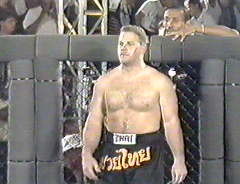 Well, look who Art Davie and Rorion Gracie book as the representative of Thai Kickboxing. The 5'9", shortest kickboxer possible in the world, "Carolina Pain" Roland Payne. The announcers note he is the 'Smallest man in competition'. Way to stack the deck, Rorion, you fuck.
