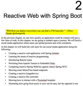 Thanks to Spring guru Brian Clozel, there is an experimental project that autoconfigures Spring Boot for Reactive Spring, and will eventually get folded into the Spring Framework. Bottom line: Reactive Spring is available for coding today, albeit not with every feature needed. But since the target release date is May, there will be time for spit and polish against the book’s code base.