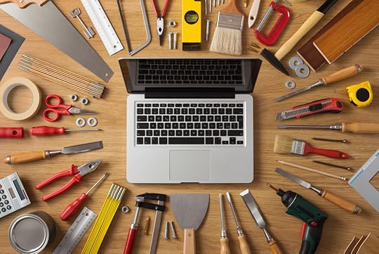 Laptop on a work table with DIY and construction tools all around top view hobby and crafts concept