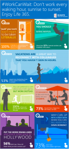 I remember a graphic that came out of Microsoft showing how you could access every aspect of your job from everywhere – a kids soccer game, waiting for an appointment, during breakfast, etc. 37Signals released a mocked up variant with the same style, only they dubbed it Work Can Wait (which you can see linked her). The thing basically stresses the importance of having a life.