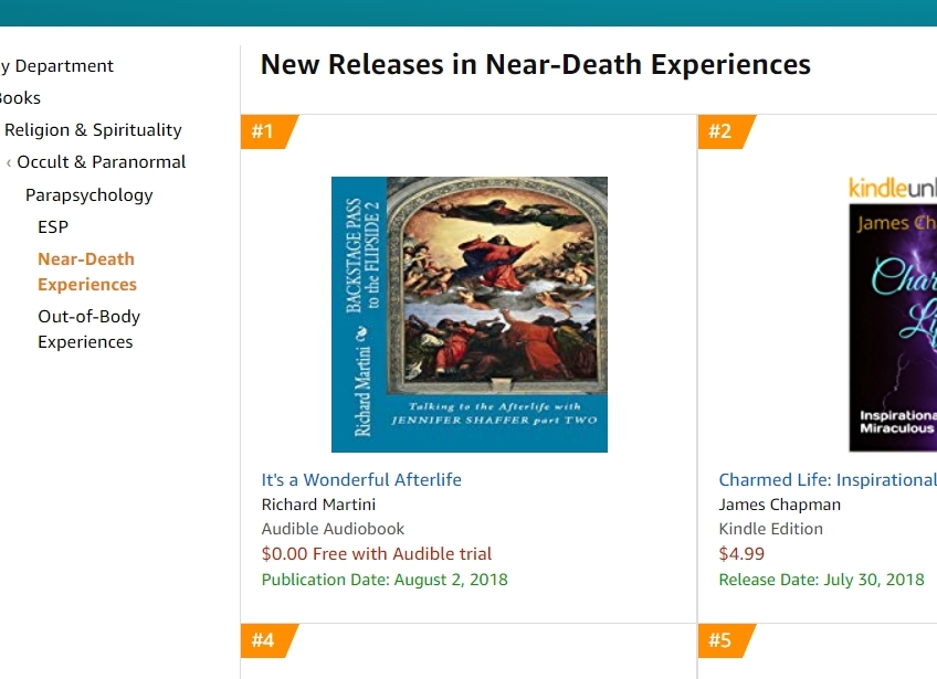 (Funny, audible recently switched the genre to "unexplained phenomena" - so it's just a hot new title rather than #1. They also had put up the wrong title - not "it's a wonderful afterlife" but "Backstage Pass to the Flipside" which is fixed below.)