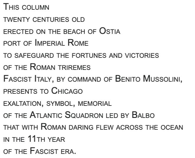 He brought with him a 2,000 year-old-column as a gift to the people of Chicago from Benito Mussolini. The column, which I have passed many times on my rides along the lakefront trail, bears an inscription in Italian which when translated into English says the following: