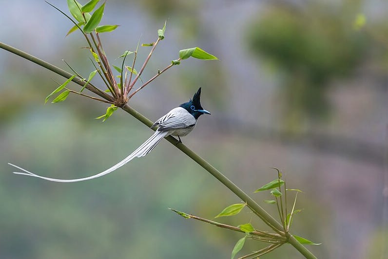 Asian Paradise Flycatcher. Photo credit: Wikimedia CommonsI never made it to another mridangam class. But I did join Hari and the birdwatching club on their Sunday morning walks sometimes led by S. Rangaswami, one of India’s leading ornithologists, who once told a gathering of us, ”Bird-watching … is the art … of watching birds.”
