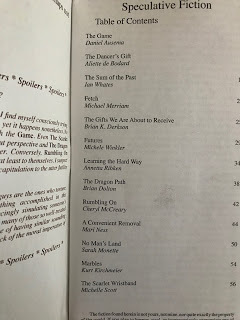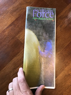 I mentioned in my November Lyrical Worlds newsletter that I would share pictures of the original publication of the reprinted story in it, "The Game."Fictitious Force had a unique shape. I suppose it was simply folded the other direction (hotdog bun style instead of hamburger bun style, as I used to explain to kids), but it definitely makes it stand out in my box of contributor copies. The cover for this issue was even inspired by my story, so that's a cool thing.
