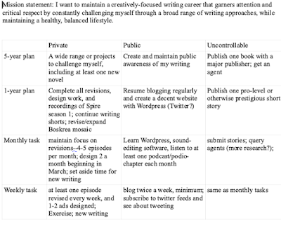Those were (and still are) the columns of my table of goals. Then the rows are broken down into a 5-year goal and a 1-year goal and then below that the monthly and weekly tasks that could help me achieve those goals. In recent years I've filled the space below that with a month-by-month breakdown of the year, which was especially important, for example, when I was serializing the Spire City seasons.