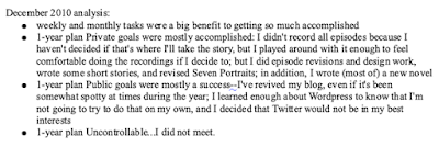 So, for example, this is what my 2010 goal sheet—the first year I did this—looked like (this was before Musa had accepted the Spire City serial, and at the time I was contemplating releasing recordings of the episodes on Podiobooks):