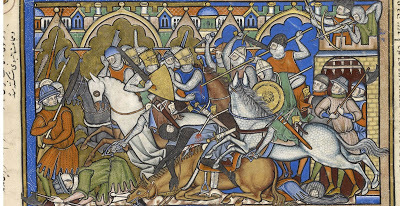 “He said to his men, "Spare no-one you set eyes on now, and do the same to them as they are doing to us." So they began killing the other side, savagely attacking them everywhere with the sword. The men on foot had retreated from the slaughter of their fellows when they saw many of their people fall, but boldly joined the combat of the mounted men; they gutted many of the horses and cut their girths, so that their riders fell to the ground.” (Henry of Knighton)