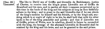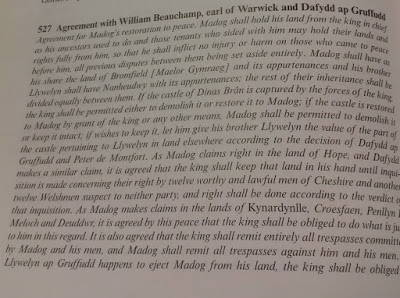 Finally, Madog agreed to give his brother Llywelyn the value of the castle in land. This was according to the decision of Prince Dafydd and Peter de Montfort; at this point Dafydd appears to have acted as Prince Llywelyn’s ‘viceroy’ in northern Powys, with jurisdiction over the local princes.