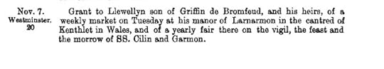 In the years after 1277, Llywelyn found that his defection to the English crown was not a passport to joy. He did not go without rewards: in November 1279 the king granted him and his heirs a weekly market and annual fair at Llanarmon Dyffryn Ceiriog in Cynllaith. This promised to create new wealth in the lordship, but also caused friction with the rival market at Oswestry.