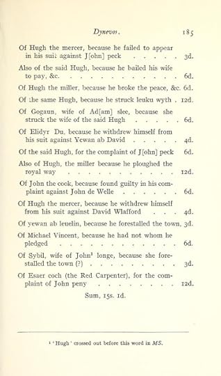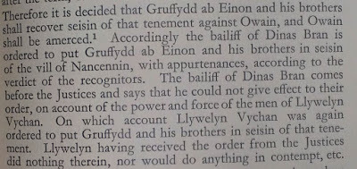 A Welsh judge or ynaidLlywelyn and his brothers refused to surrender an inch of ground to these upstarts. The sons of Einion ap Gruffudd won their case in respect of the vill of Nancennin, and the king’s bailiff of Dinas Bran was ordered to put them in possession. He reported he could not so because of the power of Llywelyn Fychan, who refused a direct order from royal justices to give up the vill.