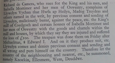 Worst of all (he claimed), Llywelyn himself, when on the road to Chester carrying letters from the king, had been ambushed and kidnapped by the soldiers of Gwenwynwyn and Roger Lestrange. He and his men were held in prison until they bought themselves out. This protest should be cross-referenced with a separate entry in the Welsh assize roll. The latter reveals that Llywelyn had sent his men to burnt the mill at Coedgoch and houses belonging to Isabella Mortimer and the men of Oswestry, to the value of £100. Or so they alleged.