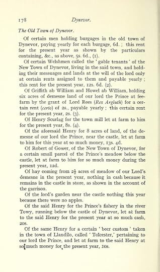 Some Welsh tradesmen moved from the old borough to the new. These were called “gable tenants”, apparently capitalizing on the availability of new burgage property. Everyone in Dinefwr at this time held their land and property of Edward of Caernarfon, referred to as “our lord the Prince.” The king had farmed out Wales to his son, along with the lordship of Chester, the county of Ponthieu and the duchy of Gascony. This was supposed to instil a sense of responsiblity in the future Edward II: some hope.