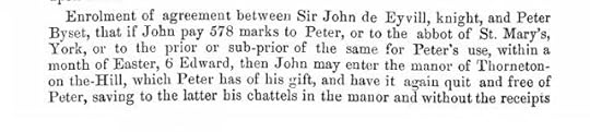 On 10 December 1276 Sir John Deyville paid 578 marks (roughly £400) to 'Peter Byset or to the abbot of St Mary's York', thus gaining the right to re-occupy his Yorkshire manor of Thornton-on-the-Hill on 20 September. This appears to have been the final redemption fine he owed to the queen, Eleanor of Provence, as the price for his rebellion in the previous decade.