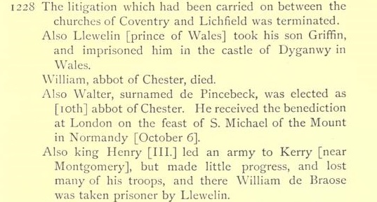 In September 1228 Llywelyn the Great seized Gruffydd, his son by his first wife, and imprisoned at Degannwy castle. This apparently occured just prior to Henry III’s Ceri campaign in that year; since Ceri was an area that had been under Gruffydd’s control it may be that the king was acting on behalf of his vassal, just as he would later claim to do in 1241.
