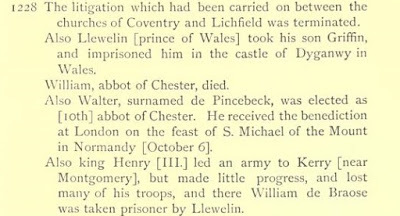 The late summer of 1238 witnessed all kinds of maneuvering and power play in Wales. Unfortunately not all the documents have survived, but some reasonable assumptions can be made. On 9 August Henry III wrote to Llywelyn the Great, informing the prince that he would be at Shrewsbury on 22 September to discuss royal power in Wales. The language is blunt: this was all about power - potestatem - and nobody was pretending otherwise.
