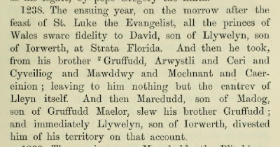 As an aside, Llywelyn’s first wife - and Gruffydd’s mother - is said to have been Tangwystl Goch, daughter of King Reginald of Man. Reginald had no such daughter and there was no such person: the alleged daughter was invented in the 17th century to clean up the genealogy.