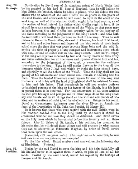 Dafydd undertook to release his brother, Gruffydd ap Llywelyn, and to submit to the decision of the king’s court on the share of his father’s lands which Gruffydd ought to have. The king would decide if the case should be settled via Welsh custom or the rule of ‘feudal’ law. Dafydd also agreed that his lands in Gwynedd should be held in chief of the crown, and he surrendered Mold castle and all lands of Henry’s barons and vassals occupied by Llywelyn the Great since the days of King John. He promised to pay war damages and restore the homages which Welshmen had once owed to John, including Welsh nobles.