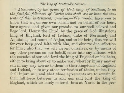 In the charter or peace agreement, Alexander referred to Henry as his liege lord. Possibly that only applied to Alexander’s lands in England, though the text doesn’t say as much. The pope was then asked to confirm the agreement, and to restrain and censure Alexander and his heirs if they ever deviated from it.