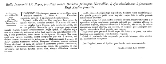 Attached is a fairly important document relating to the history of medieval Wales. It is a response from Pope Innocent IV to Prince Dafydd ap Llywelyn, dated 8 April 1245, to the latter’s plea that Wales should be held from Rome as a papal fiefdom. This would sever feudal ties to the English crown, and make Wales a vassal state of the papacy.