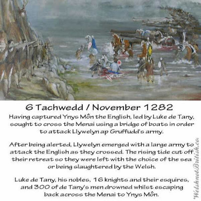 The next winter, 6 November 1282, Rhys’s brother Hywel was drowned at the Battle of the Bridge of Boats on the Menai strait. Hywel had remained a crown loyalist and was put in command of the English fleet on Anglesey: