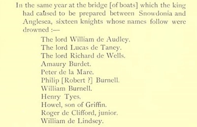 “And King Edward of England sent a fleet of ships to Anglesey, with Hywel ap Gruffudd ab Ednyfed as leader at their head; and they gained possession of Anglesey. And they desired to gain possession of Arfon. And then was made the bridge over the Menai; but the bridge broke under an excessive load, and countless numbers of the English were drowned, and others were slain”.