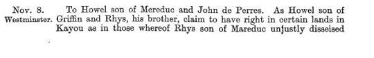 Serving two masters (4) In 1279 the brothers Rhys and Hywel ap Gruffudd lost their lands in Wales. On 8 November the king ordered Hywel ap Maredudd (one of Rhys’s colleagues on the commission to govern Wales) and John Perres to inquire into the rights of the brothers in Caeo, a commote of Cantref Mawr, which they had been unjustly ‘diseissed’ (deprived) of by Rhys ap Maredudd.