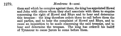 This case gives an idea of the chaotic rivalry that existed between the descendants of the Lord Rhys of Deheubarth. Rhys and Hywel were both descended from Lord Rhys via their grandfather’s marriage to his daughter, Gwenllian. Caeo itself was held by Rhys Wyndod, lord of Dinefwr and another descendant. The commote was claimed by Rhys ap Maredudd, lord of Dryslwyn and yet another descendant. Presumably this means that the brothers held their part of Caeo from Rhys Wyndod as chief lord.
