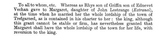 Thus Gruffudd claimed that his father was not killed with Prince Llywelyn at Cilmeri, as the Peterborough chronicler claimed, but survived and was taken back into royal service. Gruffudd’s statement is flatly contradicted by the records. On 20 April 1284 the king allowed Margaret, the wife of Rhys ap Gruffudd, her lordship of Tregarnedd in Anglesey for life. Edward was not happy about the grant, which he regarded as neither “stable or firm”, but it was made over anyway. A few days later, on 4 May, the earl of Lincoln was ordered to deliver Rhys’s lands in the cantref of Rhos over to his son, Gruffudd.