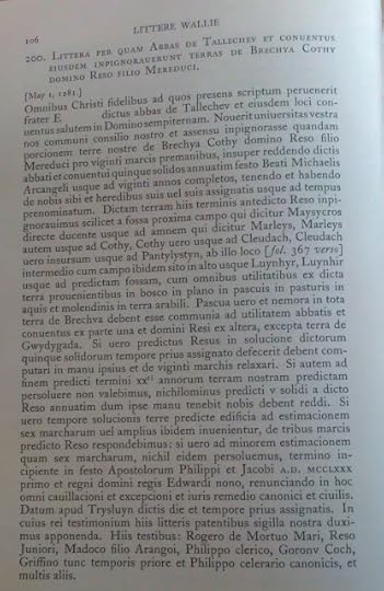 A charter dated 1 May 1281, in which the abbot of Tal-y-Llychau pledged the abbey’s lands of Brechfa in Gothi and and the land of Brechfa except for Llanegwad to Rhys ap Maredudd for eighteen years.
