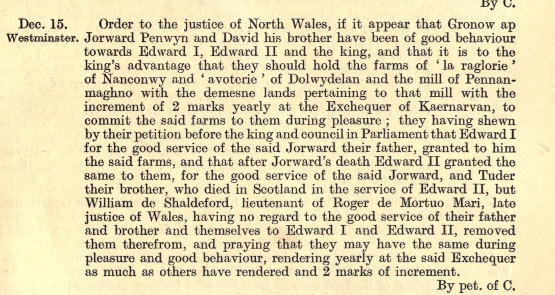 ‘Gronow Loit ap y Penwyn to the King and Council: His father served the dead King in the conquest of Wales, and afterwards Thudur, petitioner’s brother, the present King’s esquire, was killed in the battle of Stirling in his service, and also Gronow himself was twice in his expeditions of war and will always be ready, as a faithful and loyal man, for all his commands; wherefore he prays the King to grant him, before all others and for whatever term he shall please, the manor and the mill of Tryverew (Trefriw) in Nantconwy with their appurtenances, at the farm extended in the Exchequer of Caernarvon’.