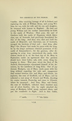Geoffrey Clement, justice of Deheubarth, was slain at 'Y Gwmfriw' in Builth. And there was a breach between Welsh and English on that feast of Michael. And Cynan ap Maredudd and Maelgwn ap Rhys were chief over Deheubarth, and Madog ap Llywelyn ap Maredudd over Gwynedd, and Morgan ap Maredudd over Morgannwg.