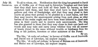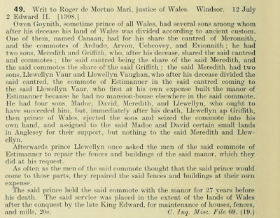 The names of their nephews, Madog and Dafydd, are not found in any other pedigrees relating to this lineage. Madog ap Llywelyn was the only contemporary figure of that name whose ancestry justified being granted tenure by barony: his father, Llywelyn ap Maredudd, had promised fealty to Henry III in 1246 on condition that and his heirs should be maintained according to the custom of Welsh barons. The tenure translated by the English as ‘Welsh barony’ was called ‘pennaeth’ in Welsh. In 1308 Llywelyn ab Owain, a lord of Ceredigion, was described as holding: