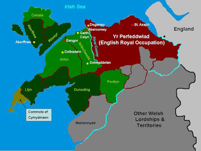 Madog is clearly identified as the most important of the four. His revolt began on Anglesey - Ynys Mon - where he attacked the township of Llanfaes and destroyed the church. His choice of Llanfaes as a target is interesting. It was one of five bond townships (maerdrefi) in Anglesey associated with the royal court of Gwynedd. It was also the commercial centre of Gwynedd under the native princes; there was a port, a ferry across the Menai strait, and a herring fishery. Under the rule of Prince Llywelyn ap Gruffudd, about 70% of of the principality’s trade passed through the port. In 1992 a hoard of over one hundred silver medieval coins were discovered at Anglesey, demonstrating its importance as a trading centre (see link below).