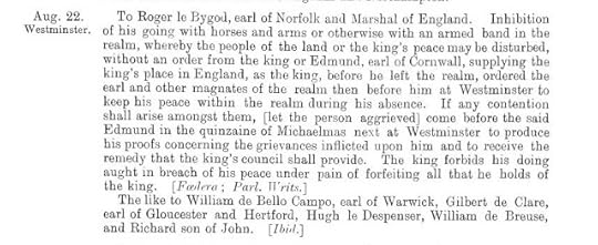 Warenne wrote his friend, the earl of Warwick, asking for assistance. Full-scale civil war in the March was on the cards, but fortunately Warwick had a few more brain cells than the average feudal gangster. He informed the regent of the brewing crisis, and Cornwall in turn issued a general prohibition against military activity. This order was specifically aimed at the earls of Gloucester, Warwick and Norfolk, Hugh Despener, William de Braose, William Fitz John, Earl Warenne and Reynold Grey.