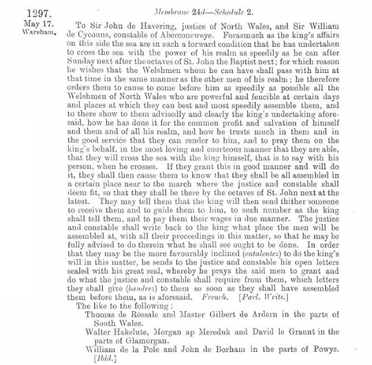 An oddly neglected Close Roll entry from 17 May 1297. This is a lengthy instruction from Edward I to his commissioners of array in Wales, detailing how they are to go about raising Welsh troops for the king's war in Flanders.