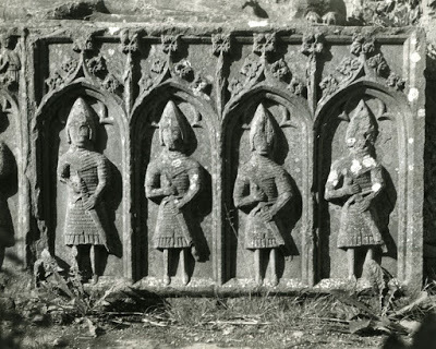 Their first certain appearance in Irish history is apparently in the Annals of Loch Cé for 1259, which records a band of eight score óglaigh (young warriors) as part of the escort of the daughter of Lord Dugall MacRory of Garmoran, Argyll, on the occasion of her wedding to Aodh O'Connor of Connacht. Attached is a pic of stone carvings of galloglass on a tomb at the Dominican Priory of St Mary in Roscommon.