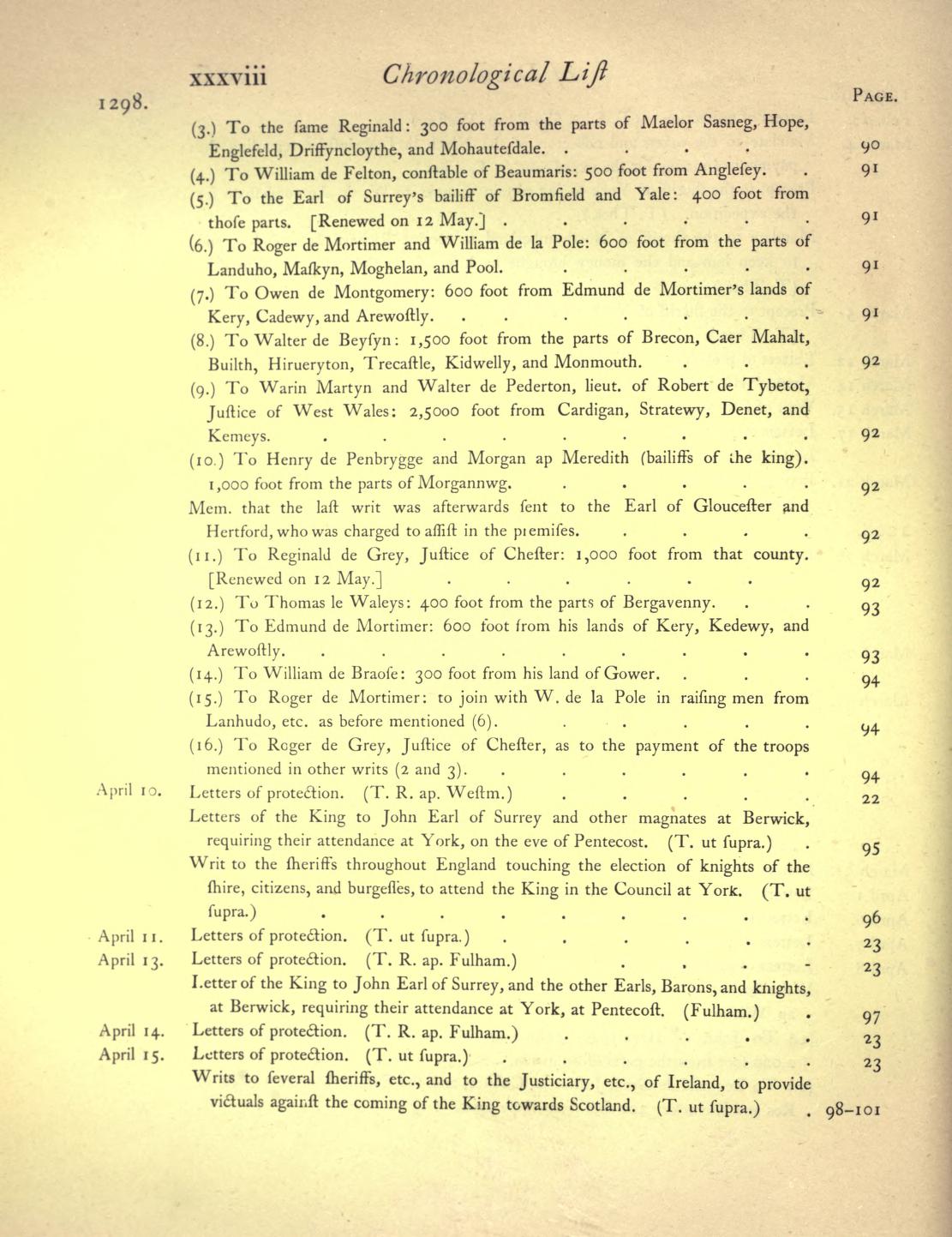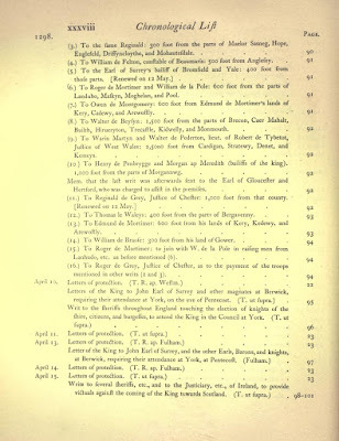 As one of Edward I’s most experienced captains, Mortimer naturally served on the Falkirk campaign. In April 1298 he and William de la Pole were ordered to raise 600 Welsh foot from the lands of ‘Lanhudo’, Maskyn and Moghelan, and lead them to the King at Chester. Mortimer and his retinue were placed in the king’s own battalion, ‘Le batayle de Roy’, among such big nobs as Thomas of Lancaster, Hugh Despenser, the Earl of Warwick and John of Brittany. His kinsman, Hugh Mortimer of Richard’s Castle, served in the same bataille.