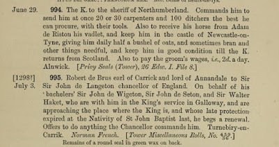 Horsey was to be kept in the castle of Newcastle-upon-Tyne and fed daily on oats, bran and 'other things needful'. In the second, dated 3 July, Robert de Bruce earl of Carrick and lord of Annadale informs the chancellor of England that he will do 'anything' the chancellor requires of him. In addition he has despatched three of his knights to join King Edward in Galloway. This is Bruce senior, father of the future victor of Bannockburn.