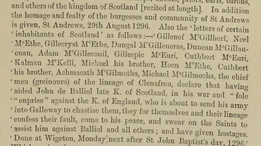 The named individuals on the list appear to have been Galwegians, probably drummed up by Robert de Bruce’s father, Bob Senior. Bruce the elder was given authority by King Ted to take submissions in Scotland, and allegedly provided the English with counterfeit banners to dupe the Scots at Berwick into opening their gates. This latter episode was omitted from a later version of the Scotichronicon, presumably because it was politically embarrassing to mention it in a Scotland ruled by Bruce’s descendants. History written by the victors.