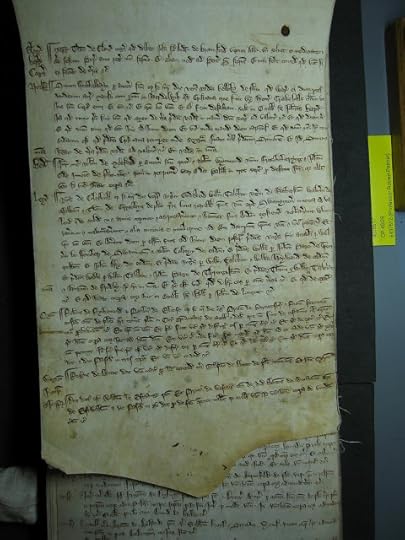 Below is a membrane of a court roll of 1278, in which one Richard Coleshill accused a gang of thieves of taking his goods and chattels from the manor of Swannington in Leicestershire.