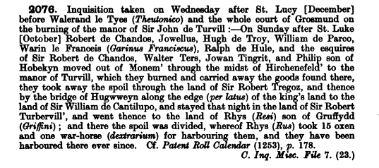 “Other, more dramatic forms of acculturation were taking place. This is evidenced by events in the south-east in October 1252, when Robert de Chandos, lord of Wilmaston in the Golden Valley, and a following that included some of his esquires, men with ‘French’ names and at least one Welsh accomplice, gathered in Monmouth, travelled through Archenfield to the manor of Sir John de Turvill, which they burned and from which they took considerable spoil. They moved on through the land of Sir Robert Tregoz (Ewias Harold) along the edge of the land of the king, into the territory of Sir William de Cantilupe (Abergavenny). They stayed a night in the land of Sir Robert Turberville (Crickhowell) and went finally to the land of Rhys ap Gruffudd. He can be identified as the lord of Senghenydd. There the spoil was divided, with Rhys taking fifteen oxen and one warhorse, as his share in return for harbouring the raiders. They were still living under his protection in December of the year.”
