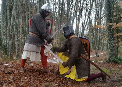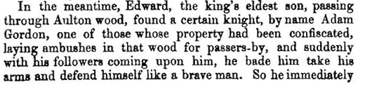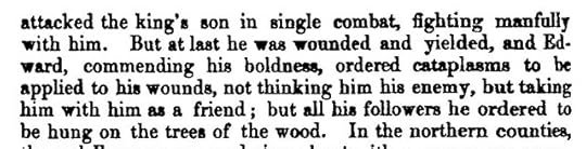 It seems Edward and the outlaw knight fought for a while, until Adam suffered a ‘savage wound’ and had to yield. His life was spared, but Edward ordered all his followers to be hanged on the trees of the wood. This was the fate of penniless thieves, who could not afford to pay ransoms. One later account says that Edward promised Adam life and fortune if he surrendered.